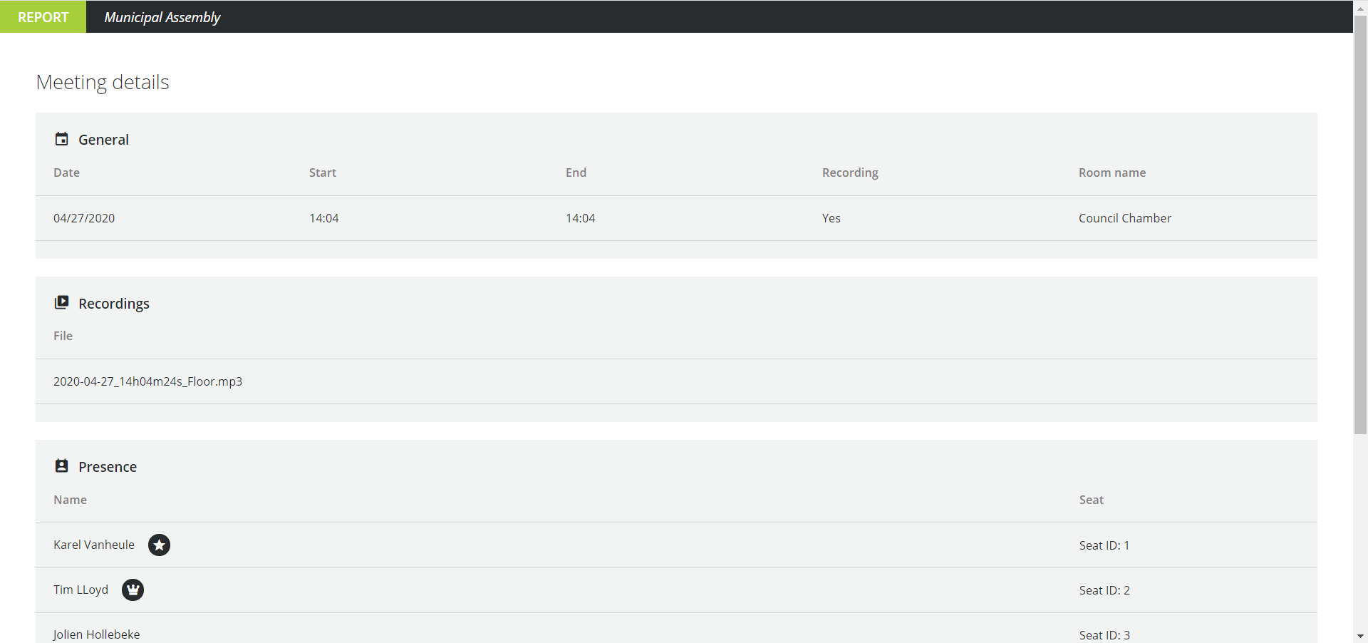 Per meeting, you can download the report and the recording (if you recorded the meeting) and see the voting results. Click the arrow icon next to the meeting to see additional information and download the recording file.