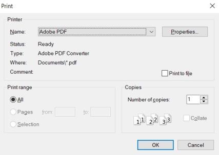 In the Printer Name field, select Adobe PDF, then cllick on OK. The report will be saved in your destination folder.